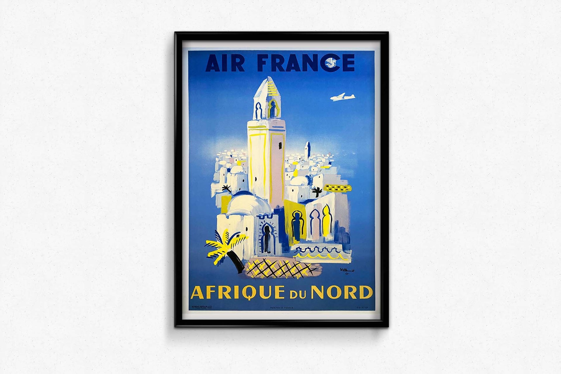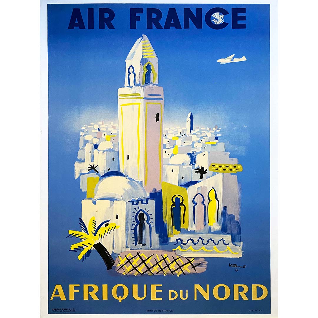 Très belle affiche originale réalisée par Bernard Villemot dans les années 1950 pour la compagnie aérienne Air France, afin de promouvoir ses voyages en Afrique du Nord. Comme souvent chez Villemot, cette œuvre se caractérise par un dessin épuré, qui invite à une lecture immédiate.