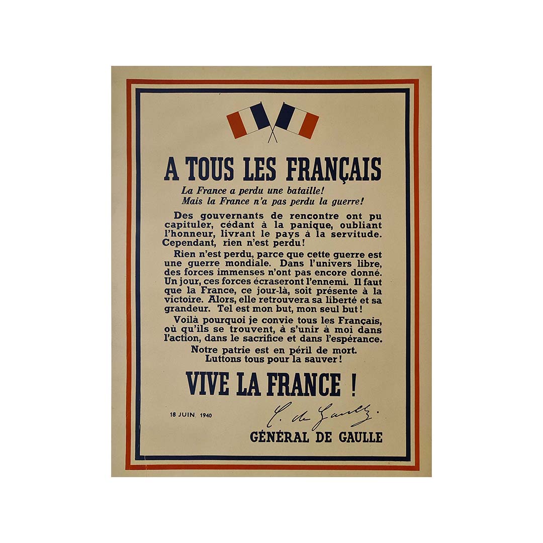 En 1940, l'affiche emblématique de Charles de Gaulle, « Appel du 18 juin 1940 », est devenue un symbole de détermination et d'espoir inébranlables durant l'un des chapitres les plus sombres de l'histoire de France.