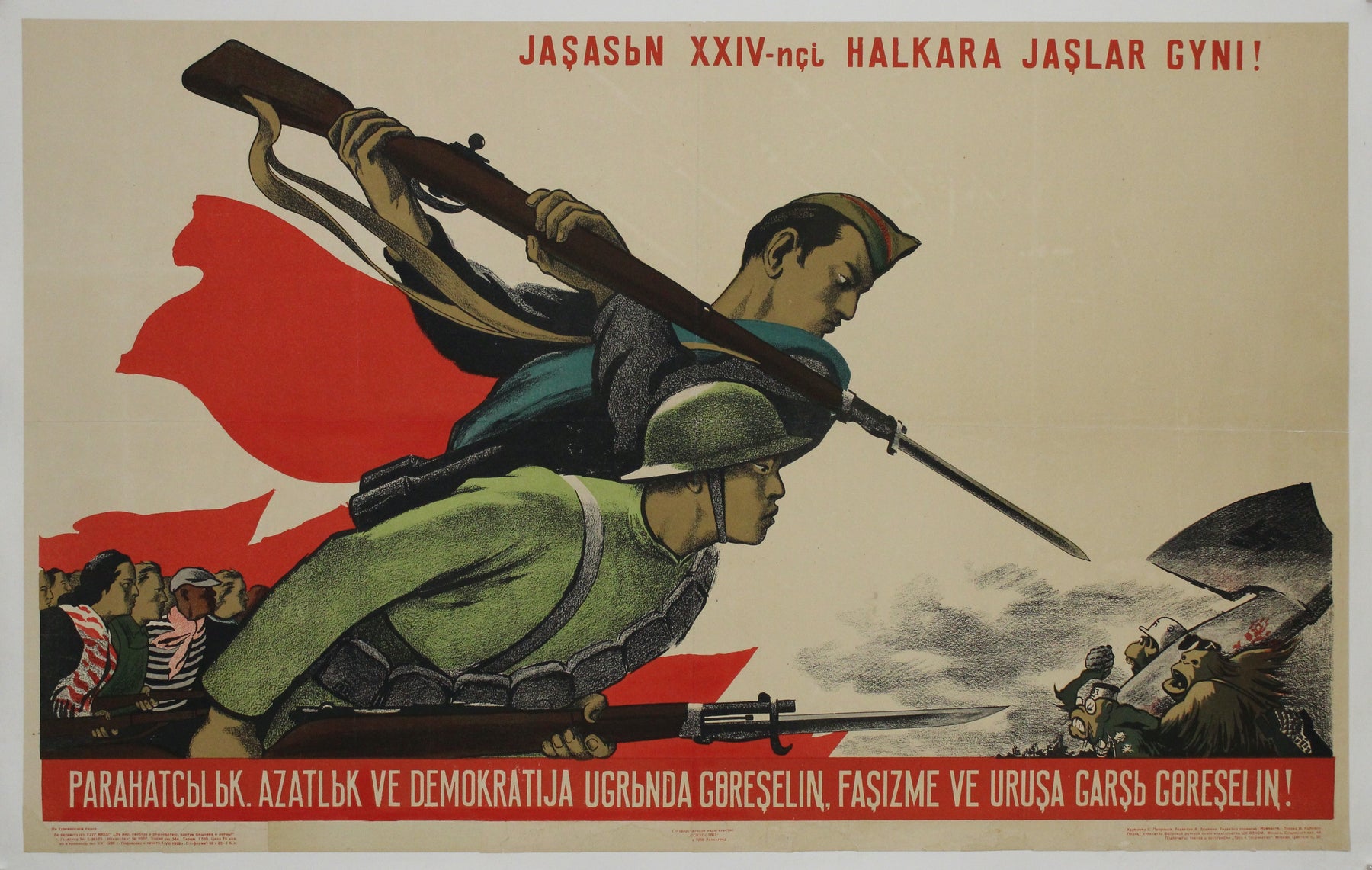Le texte en haut de l'affiche, « Jaşasın XXIV-nci Halkara Jaşlar Gyni! », signifie « Vive la 24e Journée internationale de la jeunesse ! ». Cette exclamation célèbre l'esprit et la solidarité de la jeunesse du monde entier. Le texte en bas, « Parahatçylyk. Azatlyk ve Demokratija ugrunda göreşelin, faşizme ve uruşa garş göreşelin! », signifie « Luttons pour la paix, la liberté et la démocratie, et contre le fascisme et la guerre ! ». Cet appel à l'action puissant souligne la lutte continue contre l'oppression et l'importance de rester vigilant face à la résurgence des idéologies fascistes.