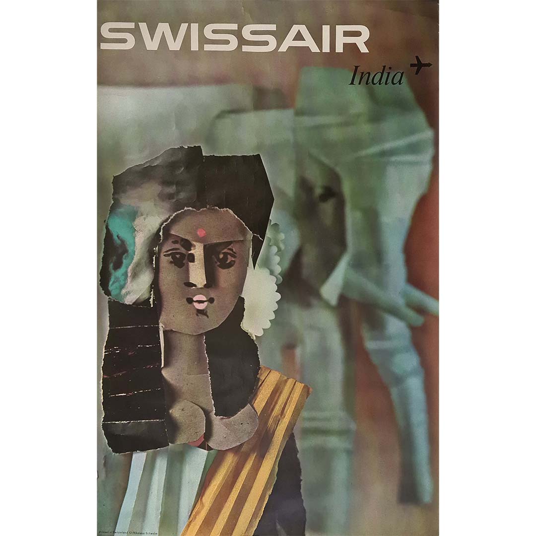 Cette magnifique affiche a été réalisée par Nikolaus Schwabe vers les années 1960 pour promouvoir les voyages et les vols de Swissair vers l'Inde.