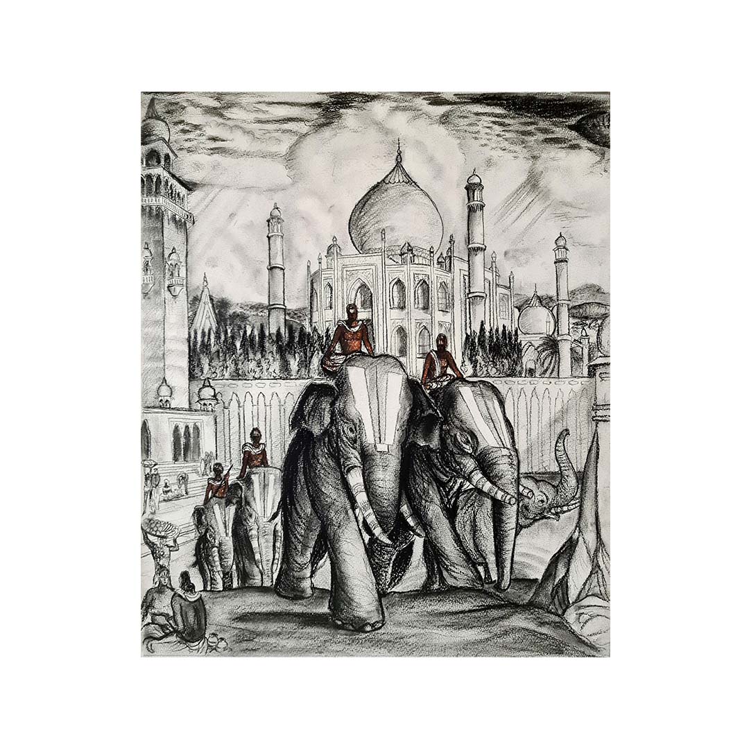 Ce dessin datant d'environ 1942, intitulé « Les éléphants sacrés – Agra, Inde » , est une œuvre captivante inspirée du style de l'artiste française Marie André. La composition présente une scène richement détaillée devant l'emblématique Taj Mahal à Agra, en Inde, et capture la présence majestueuse d'éléphants sacrés défilant dans la cour. Chaque éléphant, orné de marques cérémonielles et mené par des cavaliers en costume traditionnel, contribue à la magnificence de l'instant, évoquant la grandeur et le rituel des processions royales indiennes.