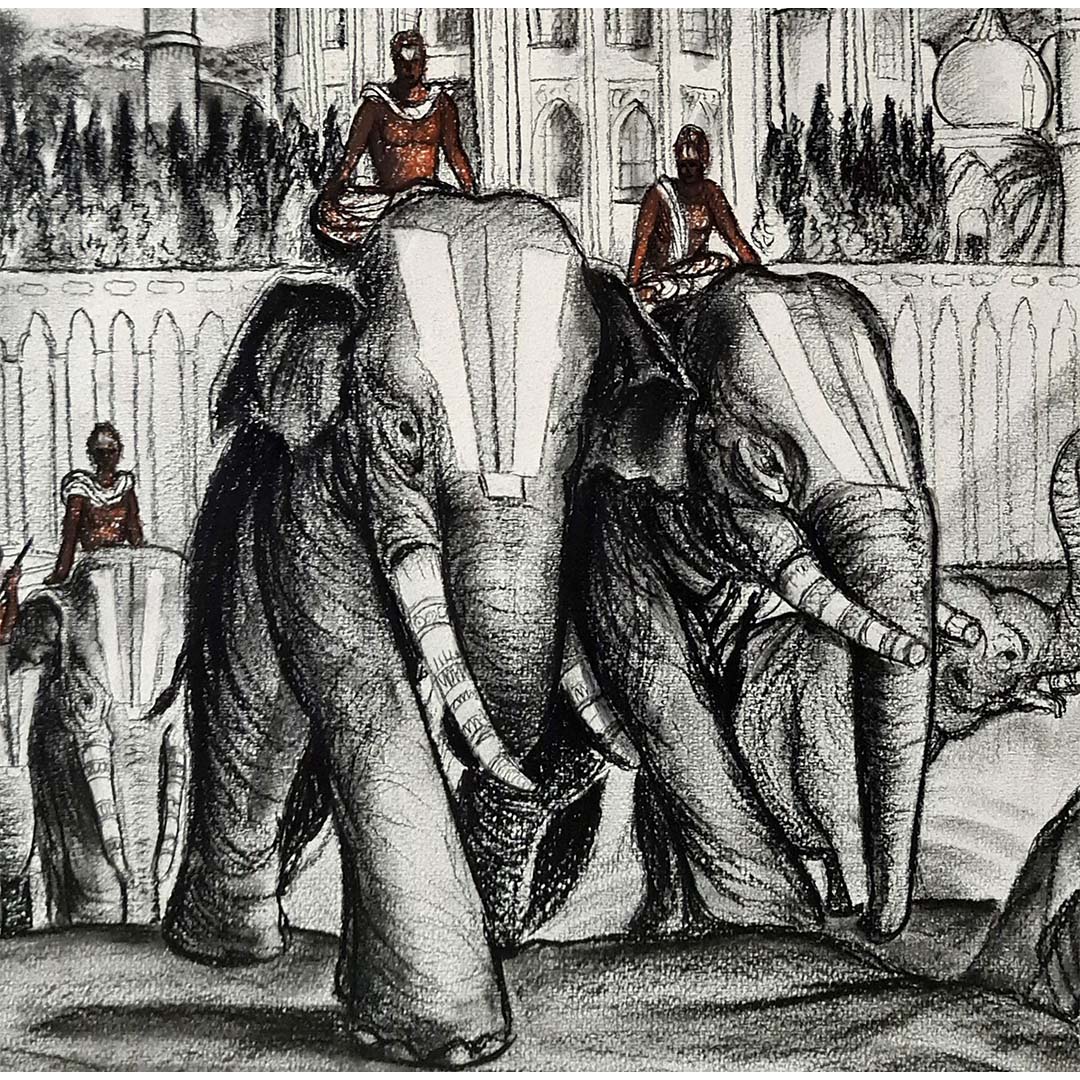 Exécuté au fusain avec une expressivité teintée de délicates touches de couleur, ce dessin reflète à la fois une fascination pour l'exotisme et une volonté respectueuse de saisir l'atmosphère du sous-continent indien. Les dômes et les minarets du Taj Mahal se dressent à l'arrière-plan, offrant un puissant contrepoint architectural à la masse organique des éléphants au premier plan.