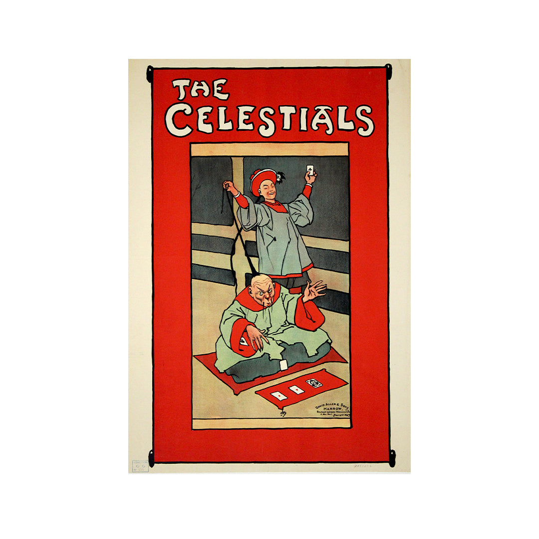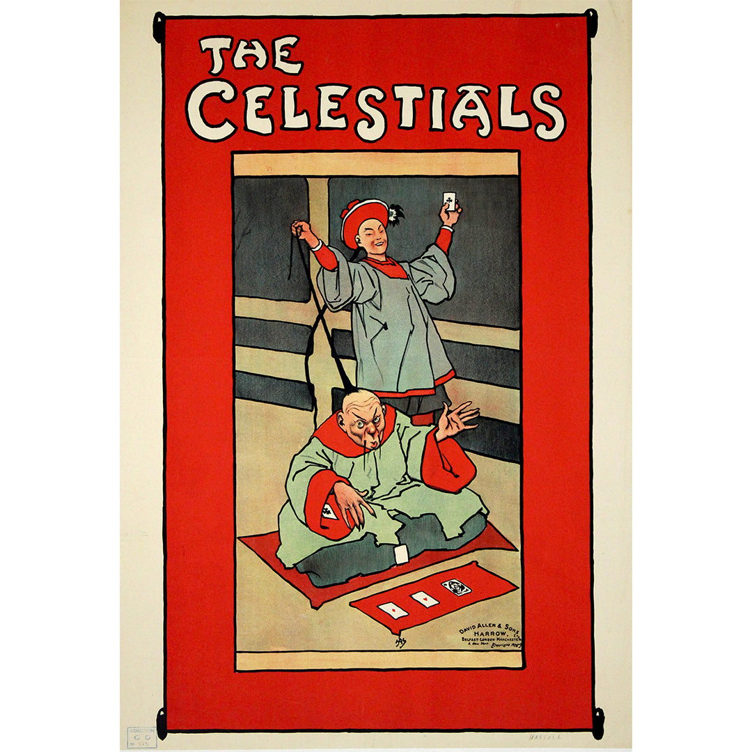 Voici une affiche originale de John Hassall intitulée « Les Célestes », créée au début du XXe siècle pour David Allen & Sons, à Harrow, Londres. Elle représente deux personnages chinois exécutant un tour de cartes de rue, dans le style iconique de Hassall : traits audacieux, aplats de couleurs, bordure rouge vif et lettrage net. John Hassall (1868-1948) fut l'un des illustrateurs et affichistes les plus influents de Grande-Bretagne, surnommé « Le Roi de l'Affiche » pour sa production prolifique d'affiches publicitaires, de théâtre et de voyage durant l'époque édouardienne. Cette affiche promouvait un spectacle de music-hall sur le thème des performances « orientales », alors en vogue, et témoigne du talent de Hassall pour allier humour, caricature et impact graphique dans une seule composition. Imprimée en lithographie sur pierre par David Allen & Sons, elle est en excellent état, avec des couleurs éclatantes et de légères marques du temps, caractéristiques d'une conservation en archives. Une pièce rare et de collection, témoin de l'âge d'or de l'affiche publicitaire illustrée britannique.