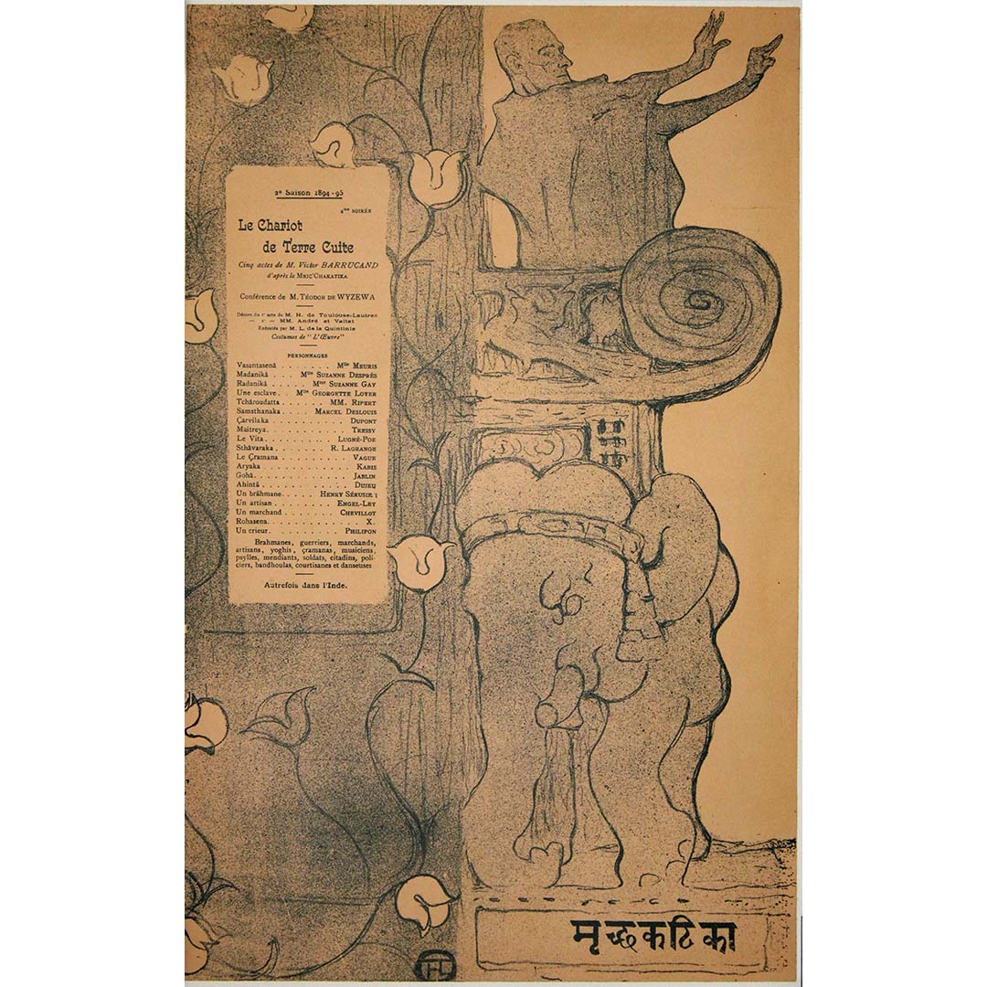 Commandée dans le cadre des productions d'avant-garde du théâtre, sous la direction de Lugné-Poe, l'affiche illustre la fusion entre Orient et Occident qui caractérisait la mise en scène. Lautrec y représente un éléphant stylisé – clin d'œil au cadre indien de la pièce – aux côtés d'une figure sculptée dans une frise architecturale, gesticulant avec emphase comme saisie en pleine représentation. Autour d'eux, des lignes fluides et une flore symbolique évoquent l'esprit Art nouveau qui animait alors le Paris de l'époque.