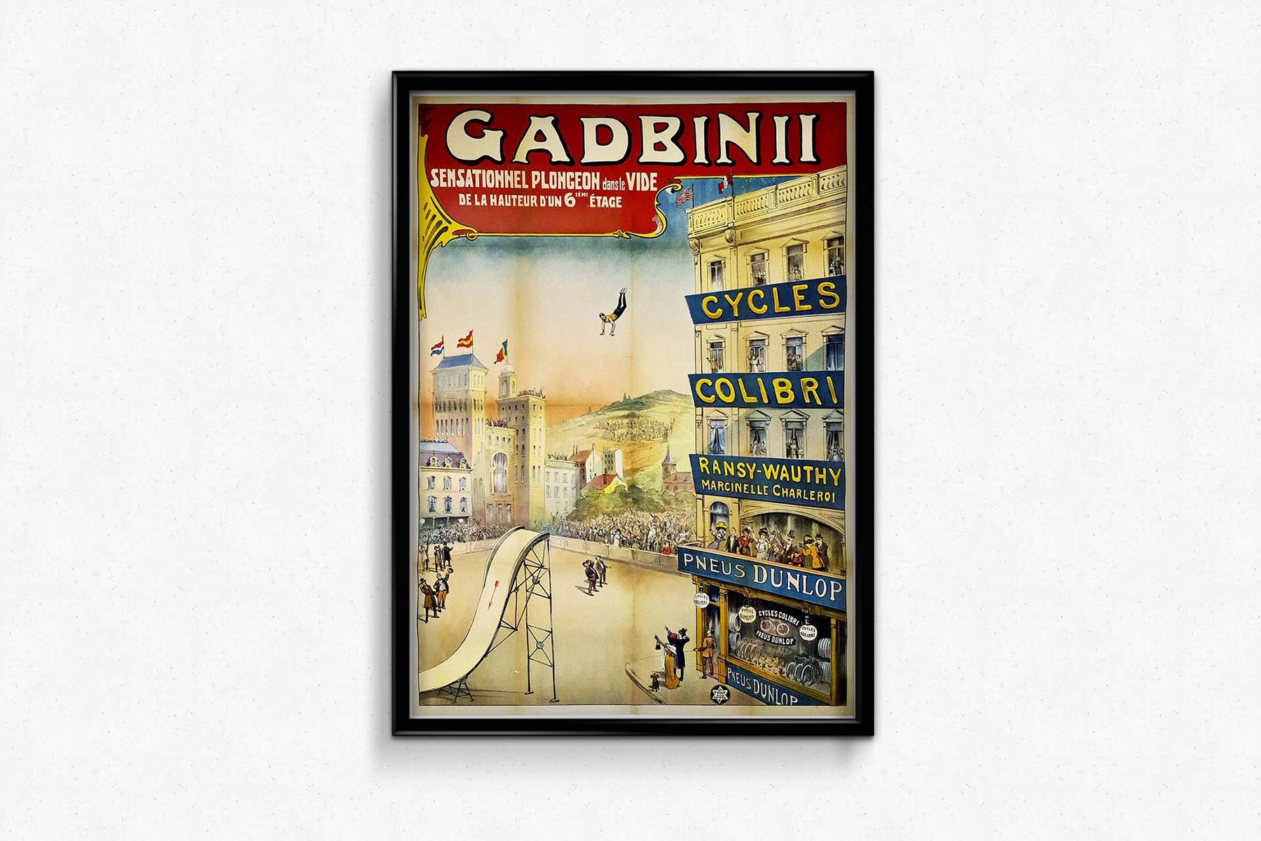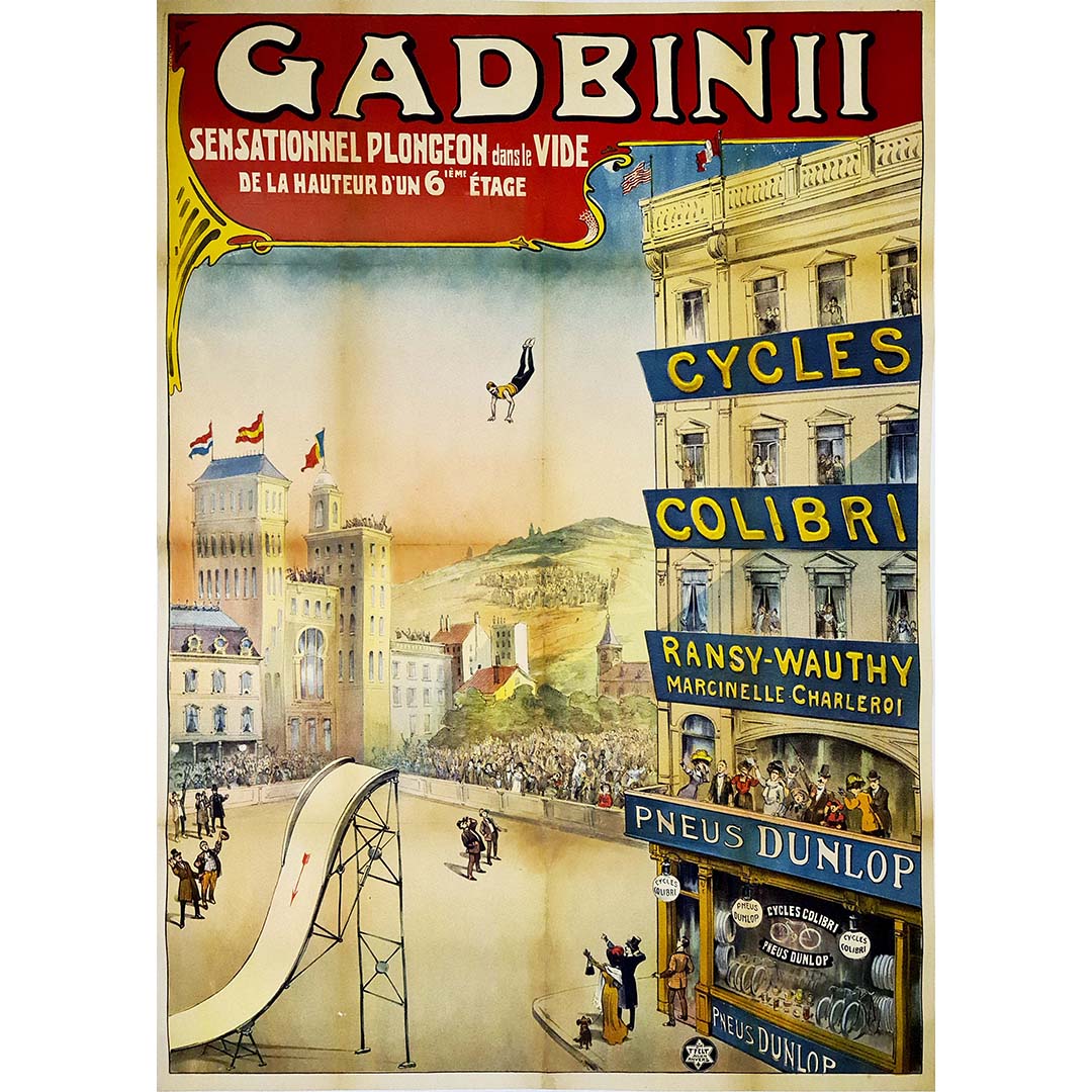 Magnifique affiche originale des années 30 pour le spectacle Gadbini et sa plongée sensationnelle dans le vide du 6e étage.
