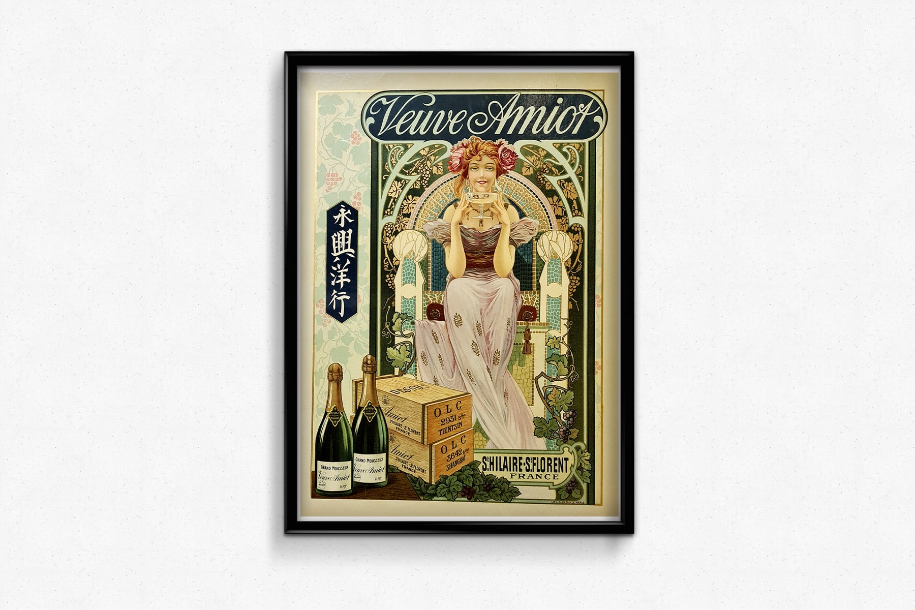 Affiche vintage originale réalisée vers 1900 pour promouvoir le champagne Veuve Amiot sur le marché chinois.
