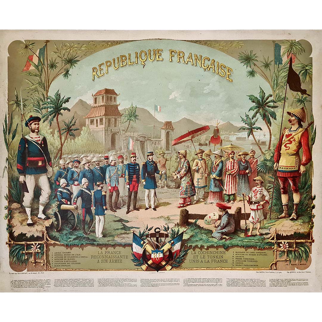 Belle affiche de la fin du XIXe siècle sur la Cochinchine et le Tonkin rattachés à la France. Honneur à l'armée et à la marine françaises, la France reconnaissante envers son armée.