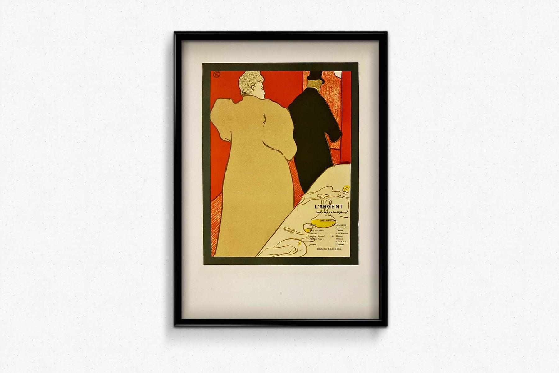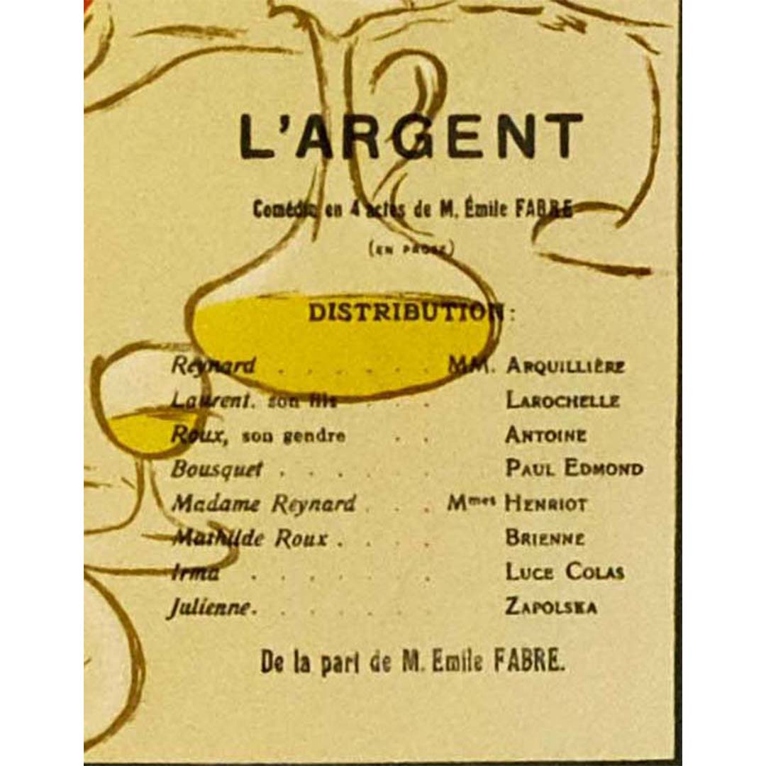 Estampe originale d'Henri de Toulouse-Lautrec réalisée pour la représentation de la pièce d'Émile Fabre intitulée « L'Argent » au Théâtre Antoine-Simone Berriau (alors appelé Théâtre des Menus-Plaisirs). Cette œuvre d'une rare intensité symboliste suggère subtilement la satire bourgeoise de Fabre à travers les silhouettes à peine esquissées de ses deux personnages principaux. Incarnant le paradigme de l'affiche moderne, les estampes de Toulouse-Lautrec jouissent aujourd'hui d'une immense renommée et sont très recherchées.