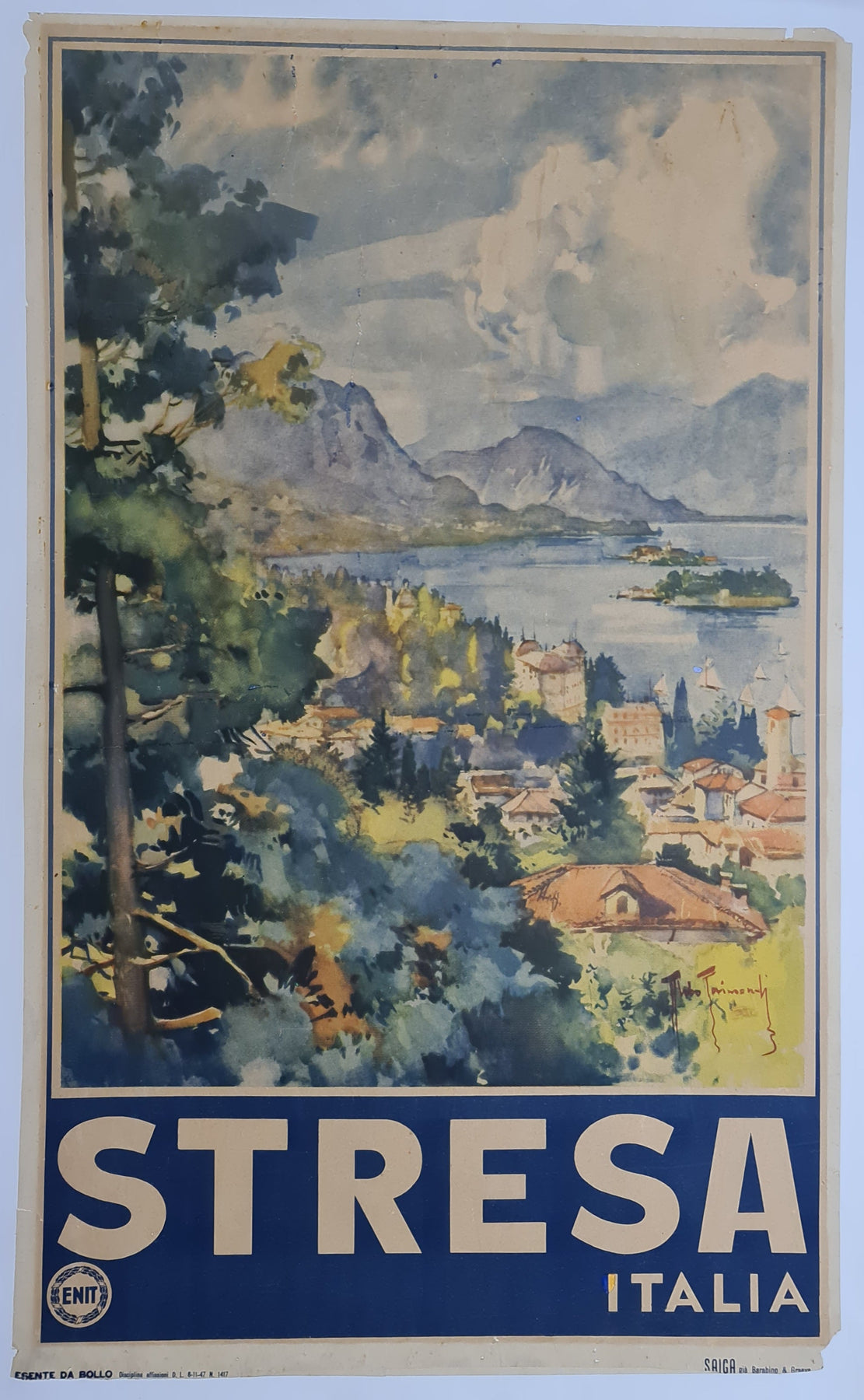 L'affiche touristique de Stresa de 1947, créée par l'artiste Theo Taimonti, est un exemple saisissant de la publicité touristique du milieu du XXe siècle. Conçue dans le cadre de la relance du tourisme italien d'après-guerre, cette affiche capture la beauté naturelle et l'élégance de Stresa, une ville pittoresque au bord du lac Majeur, dans le nord de l'Italie.