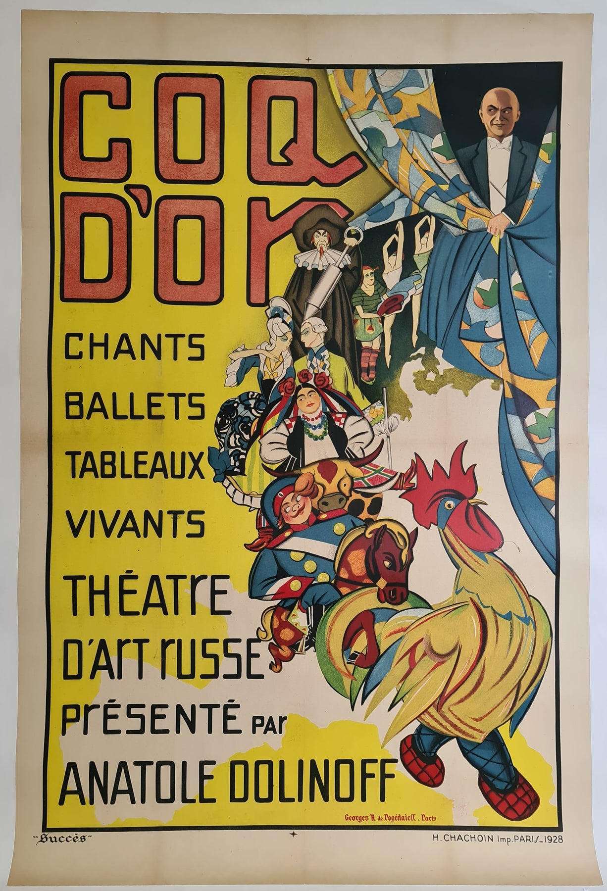 Cette affiche originale de 1928, signée Georges H. de Pogédaïeff, annonce le spectacle théâtral Coq d'Or , présenté par Anatole Dolinoff dans le cadre d'une célébration des traditions artistiques russes en France. Conçue dans un style exubérant, reflet de l'avant-garde russe, l'affiche déborde d'énergie théâtrale, de couleurs et de mouvement. La typographie audacieuse et le fond jaune vif captent immédiatement le regard, tandis que les personnages richement illustrés qui investissent la scène évoquent la magie du ballet, de l'opéra et du fantastique.