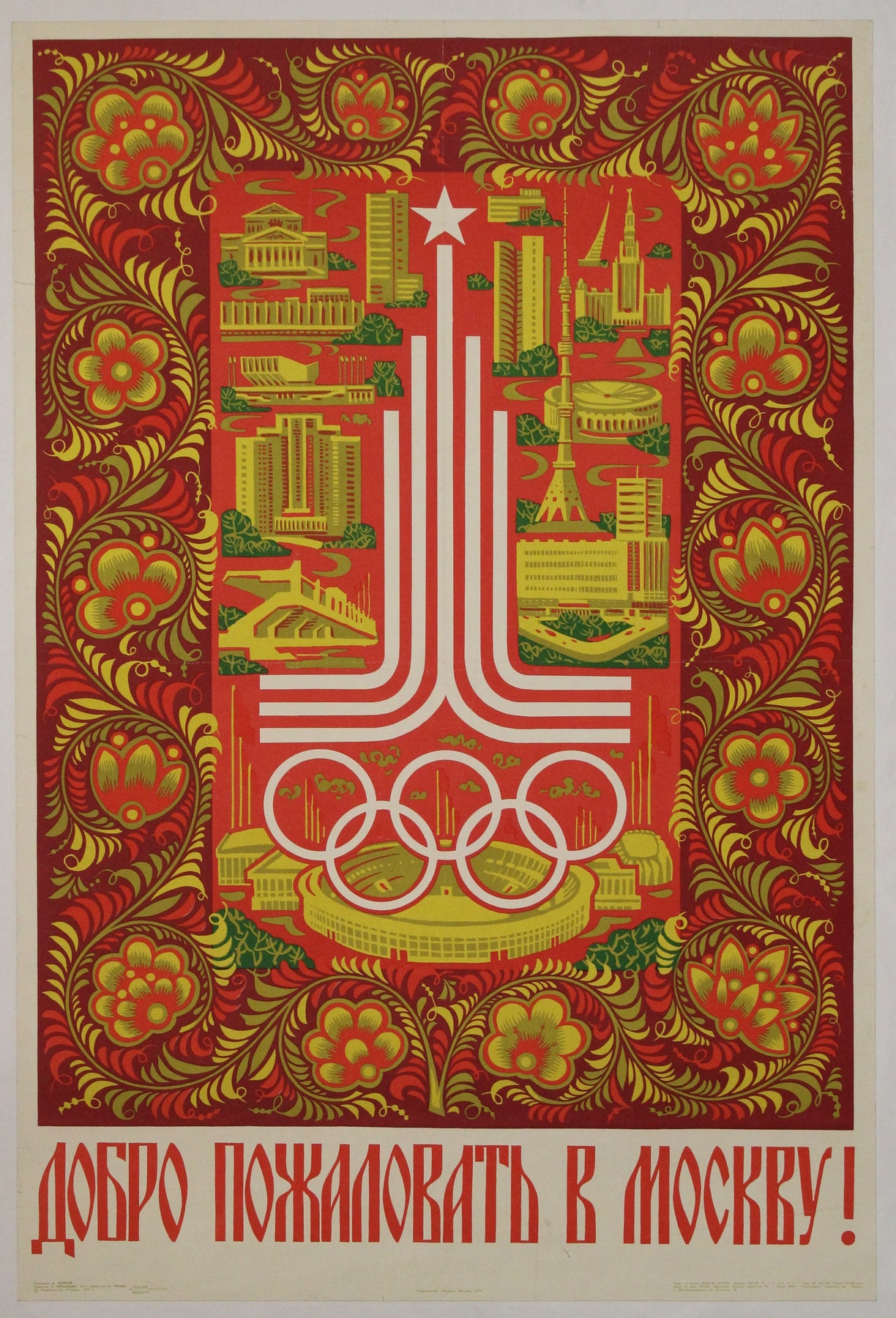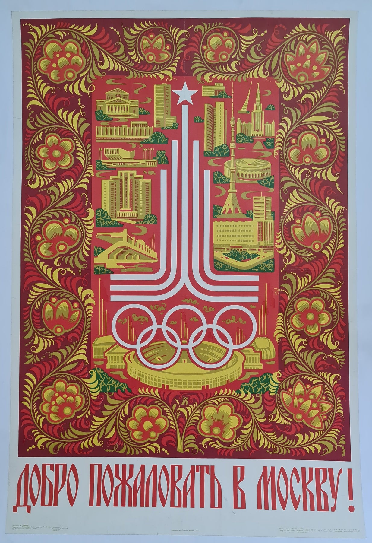 Magnifique affiche soviétique de 1979 annonçant les Jeux olympiques de Moscou de 1980.