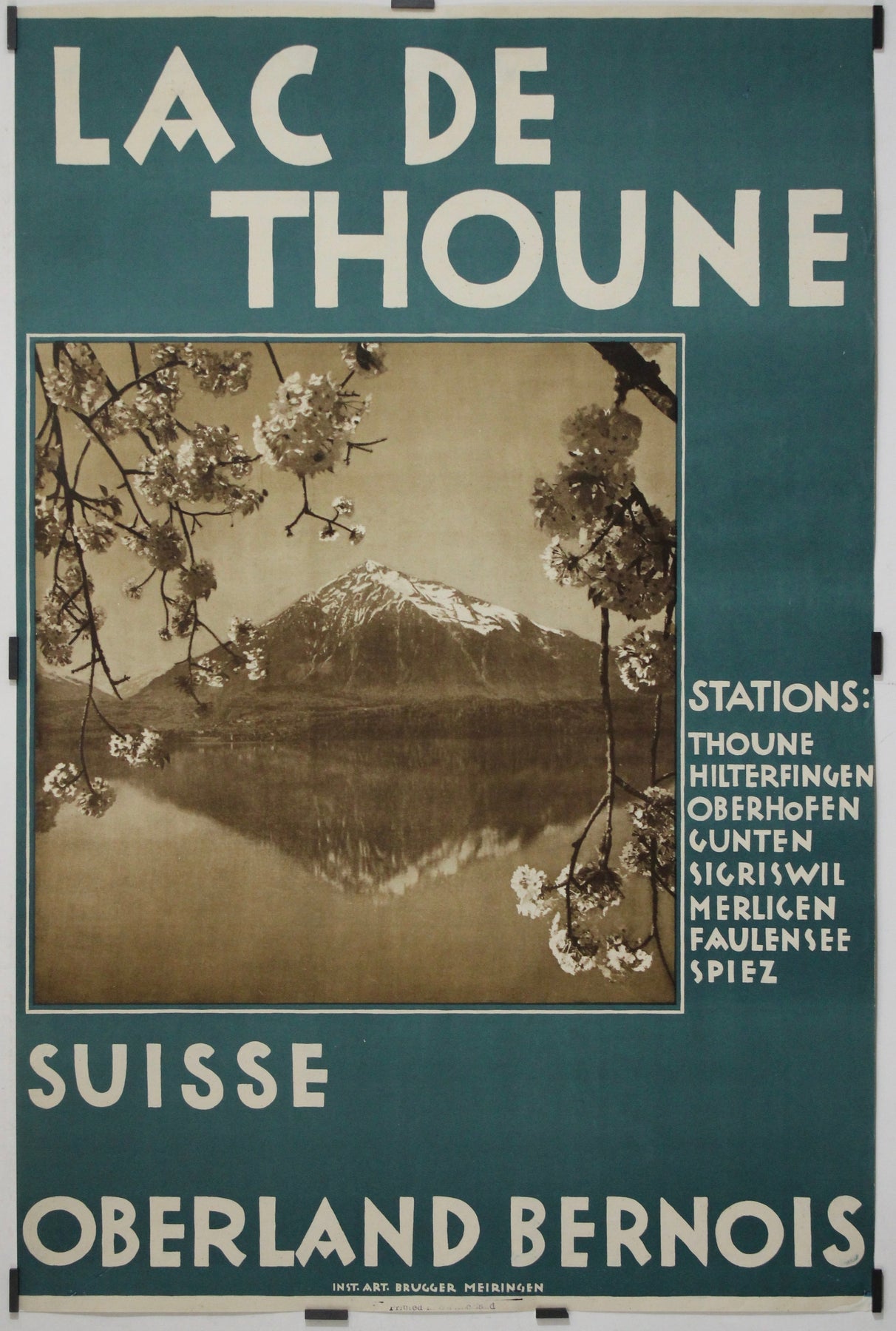 Historiquement, le lac de Thoune a joué un rôle central dans le développement du tourisme alpin, reliant Interlaken aux hautes vallées de l'Oberland bernois par des liaisons maritimes et ferroviaires. Des affiches comme celle-ci étaient conçues pour séduire un public international, promettant des paysages ressourçants, des loisirs raffinés et un accès facile à la nature.