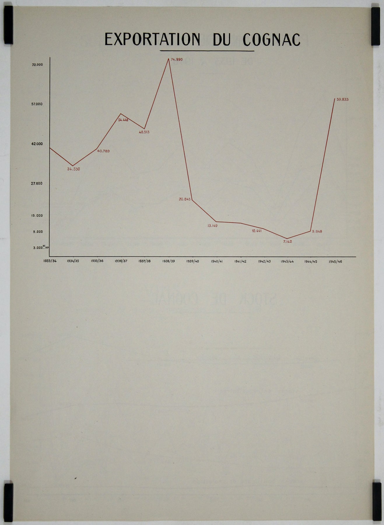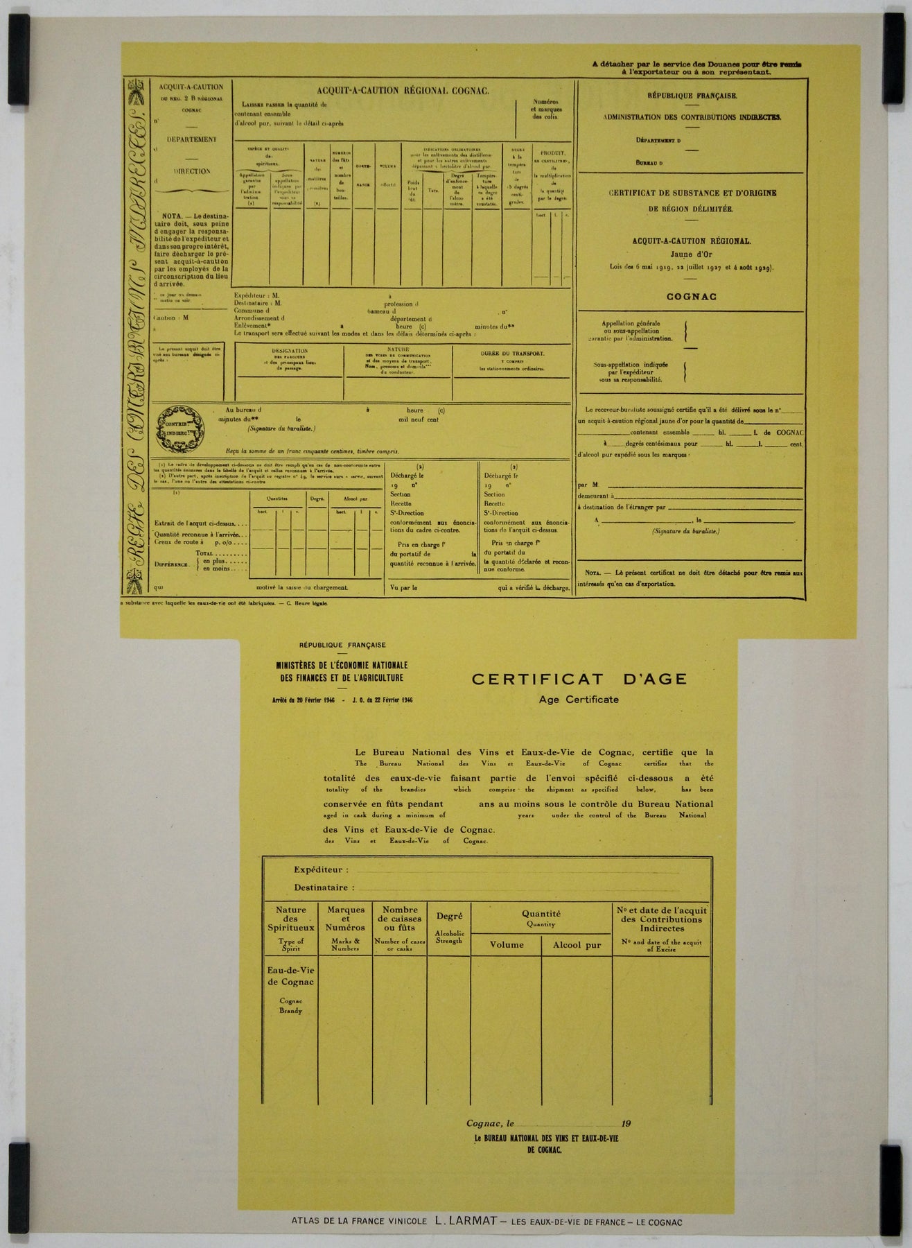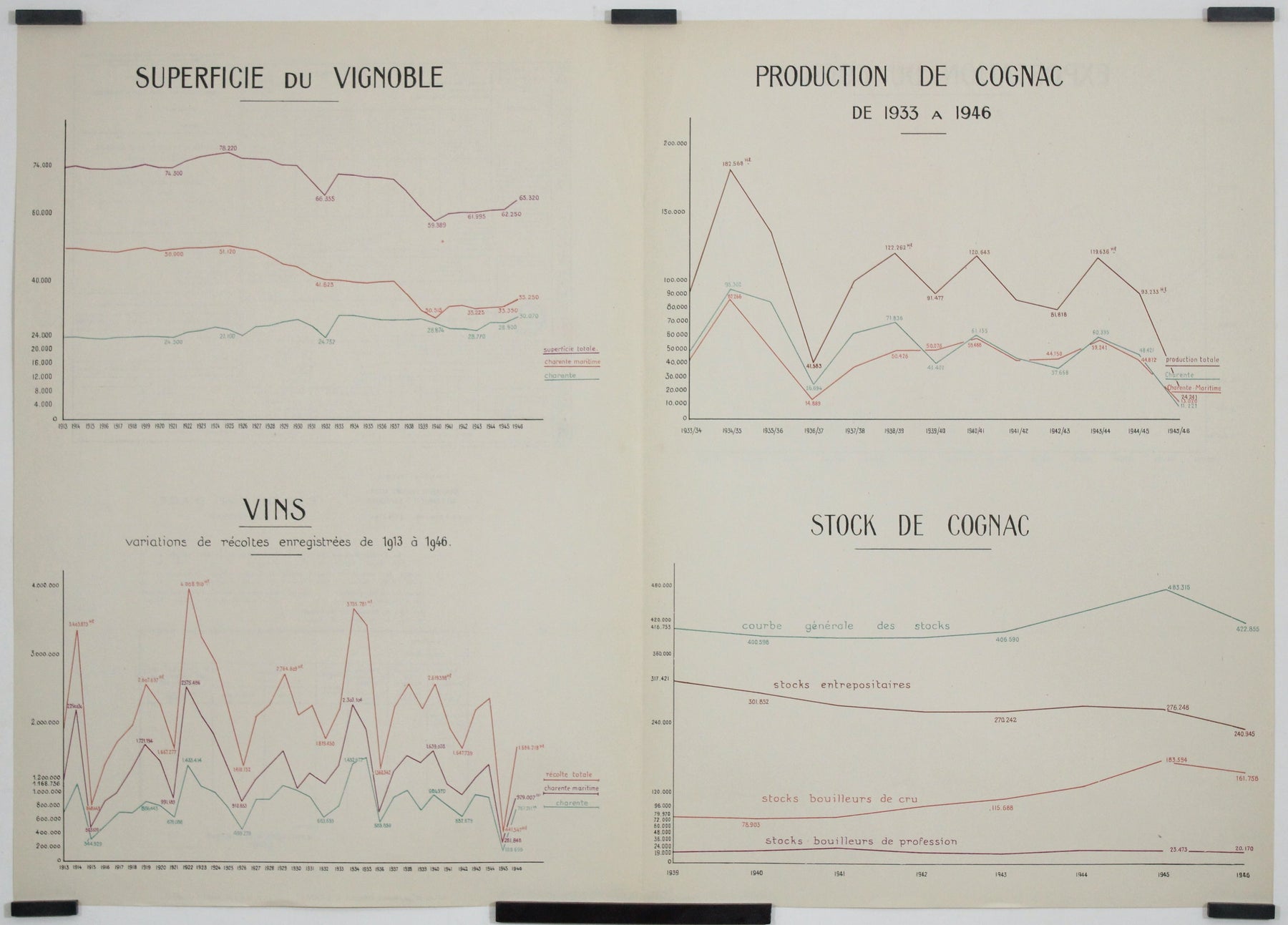 Superficie du vignoble - Variation des vendanges - Stock de Cognac - Au verso : certificat d'exportation et de vieillissement du Cognac