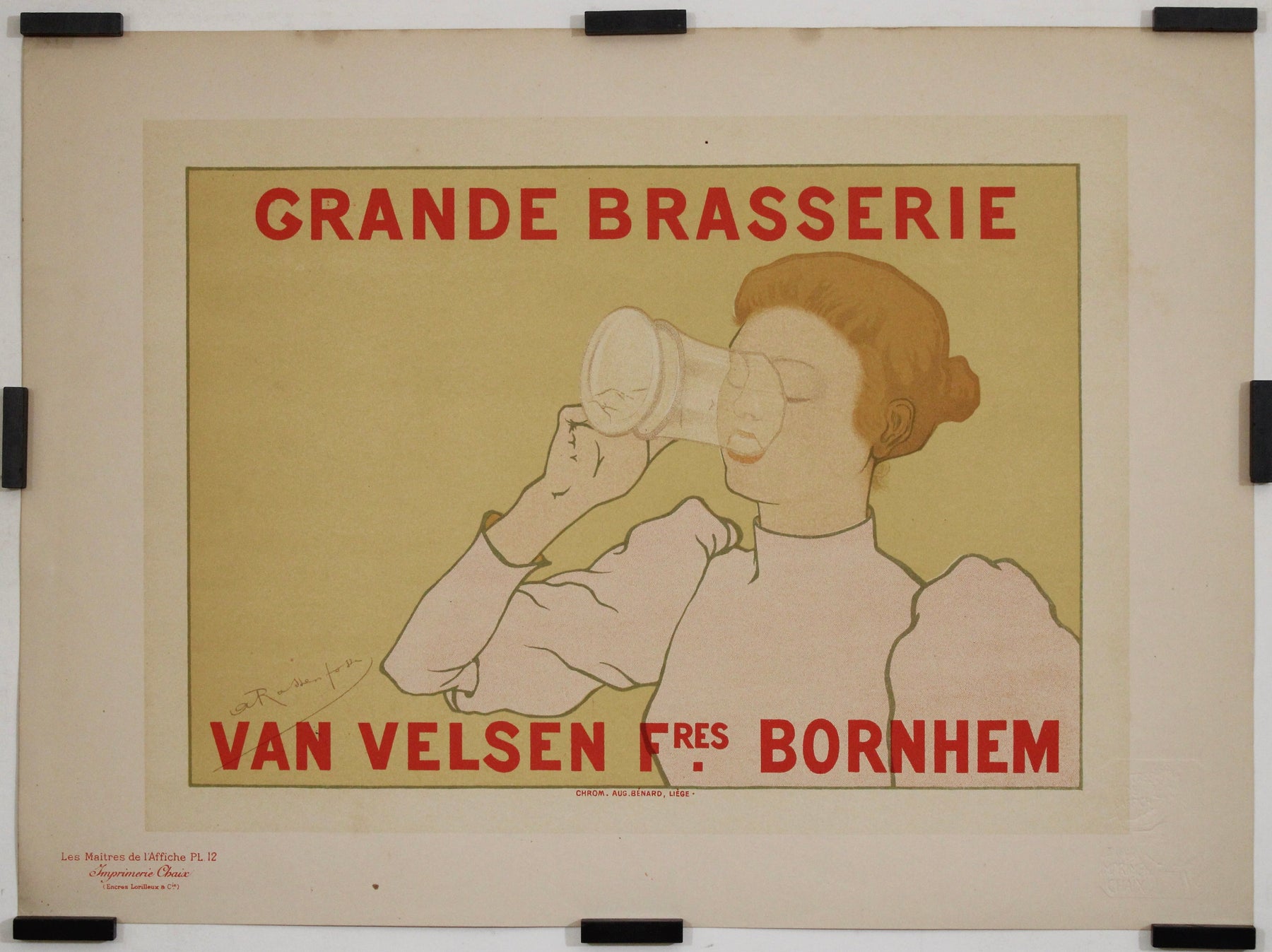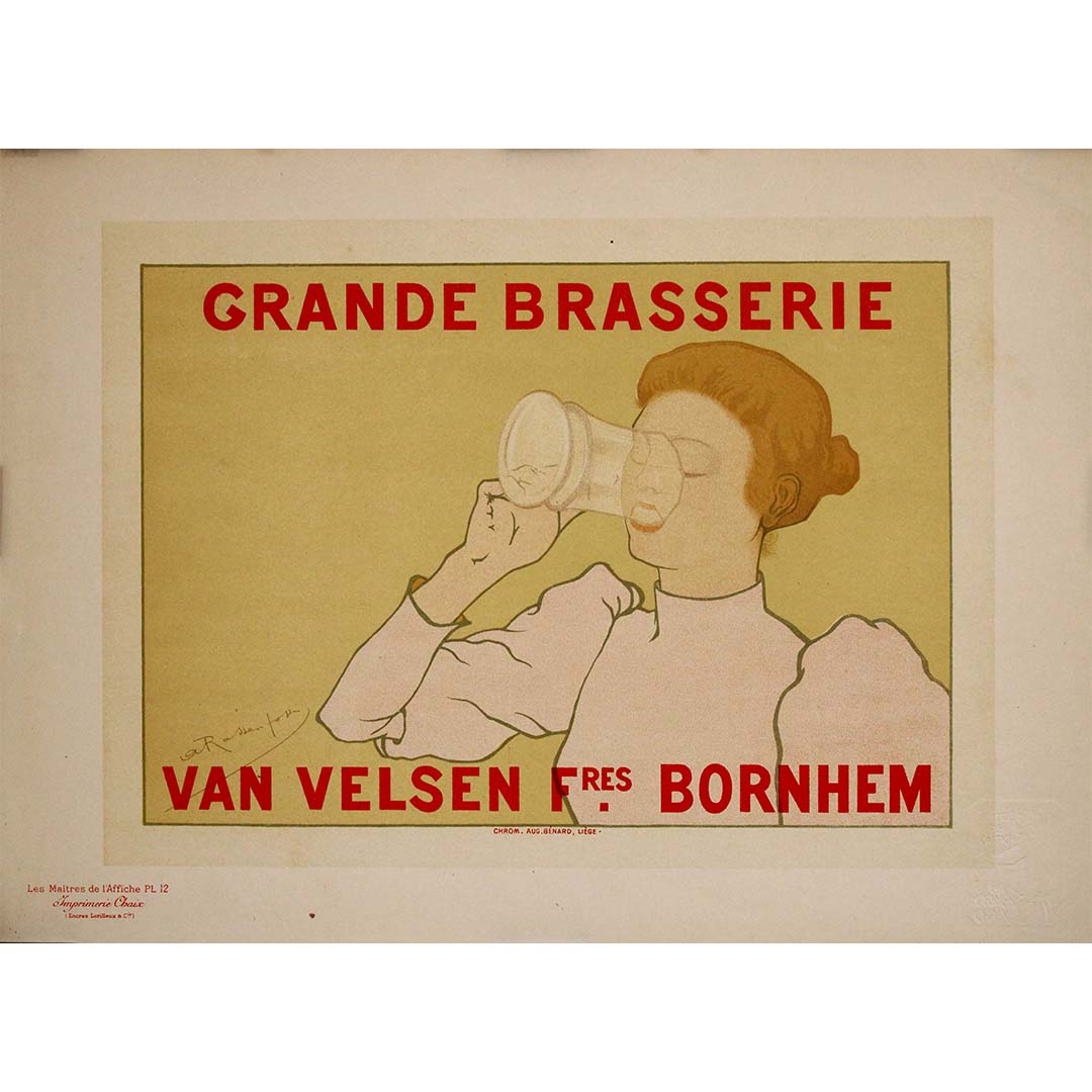 Cette création, commandée initialement pour promouvoir la brasserie Van Velsen Brothers à Bornhem, en Belgique, reflète le style visuel raffiné de Rassenfosse : délicat, élégant et d'une force discrète. Une femme rousse, aux contours subtils et aux ombres minimalistes, boit dans une grande chope de verre avec un geste élégant, presque cérémonial. Les tons pâles de sa silhouette et de sa robe contrastent délicatement avec un fond ocre feutré, tandis que la typographie rouge vif – GRANDE BRASSERIE VAN VELSEN Frères BORNHEM – apporte une touche graphique audacieuse à la composition.