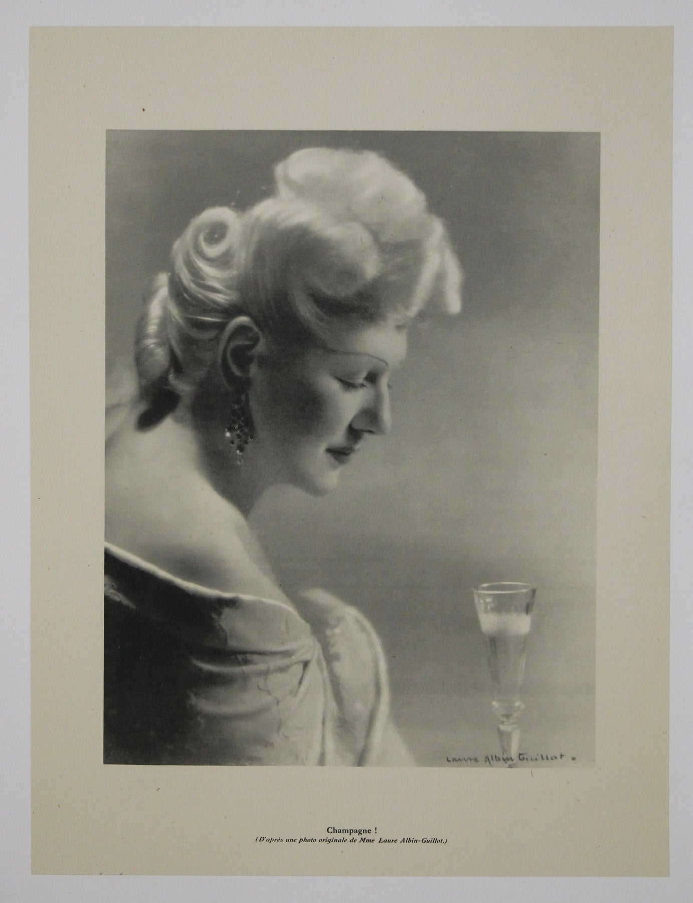 Cette affiche originale de 1944, intitulée « Champagne ! », est l'œuvre de Laure Albin Guillot, l'une des figures les plus influentes de la photographie française du début du XXe siècle. Reconnue pour son style raffiné et sa maîtrise des techniques photographiques, Albin Guillot a su capturer l'essence du glamour, de l'élégance et du raffinement parisien.