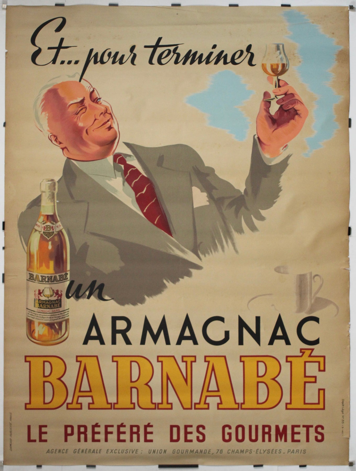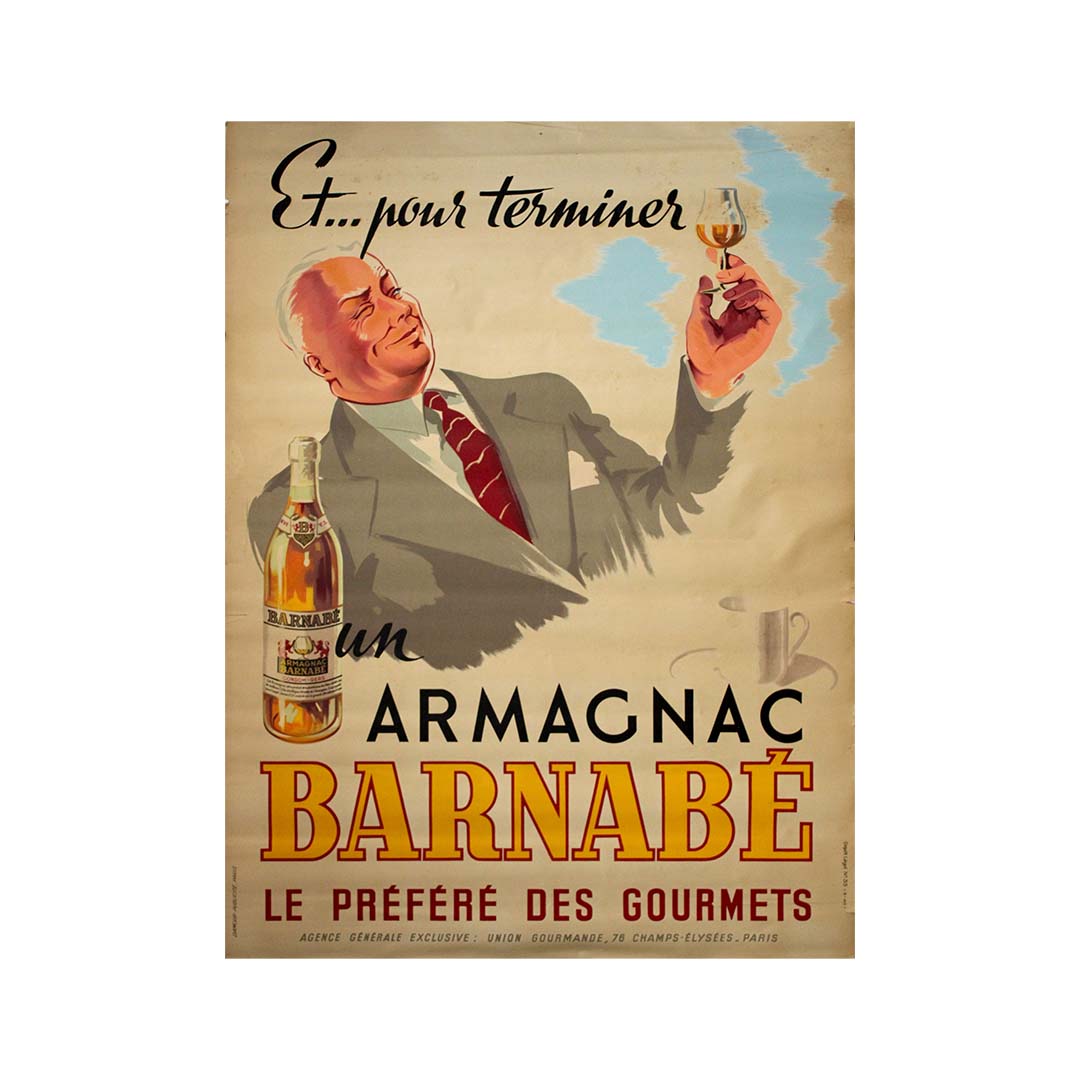 Un hommage d'après-guerre à un raffinement exquis, cette affiche publicitaire française originale de 1946 vous invite à terminer tout bon repas de façon véritablement gastronomique — avec un verre d'Armagnac Barnabé.