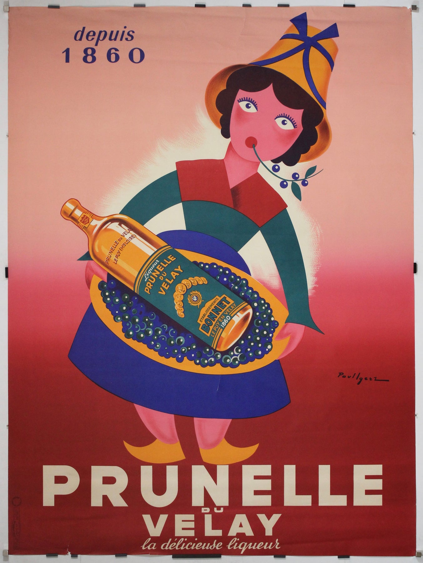 Débordante de charme et d'une sophistication espiègle, cette affiche originale et vibrante des années 1950, signée Paul Igert, capture l'essence même de la publicité française pour les liqueurs dans ce qu'elle a de plus fantaisiste. Créée pour l'emblématique Prunelle du Velay , un digestif à base de prunes produit depuis 1860, elle met en scène une jeune femme stylisée, aux yeux écarquillés, vêtue d'un costume traditionnel, offrant avec joie une bouteille nichée dans un panier de prunelles.