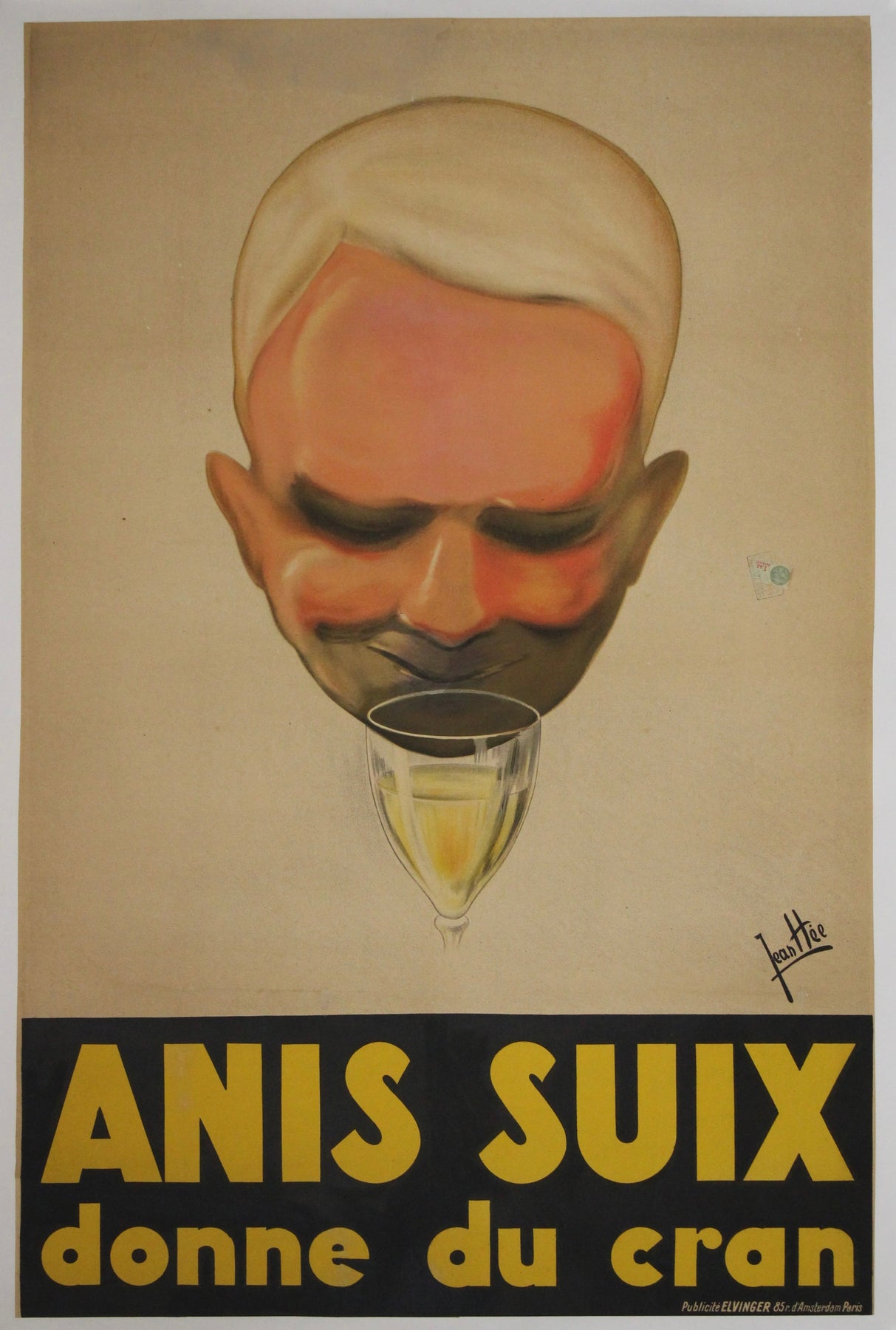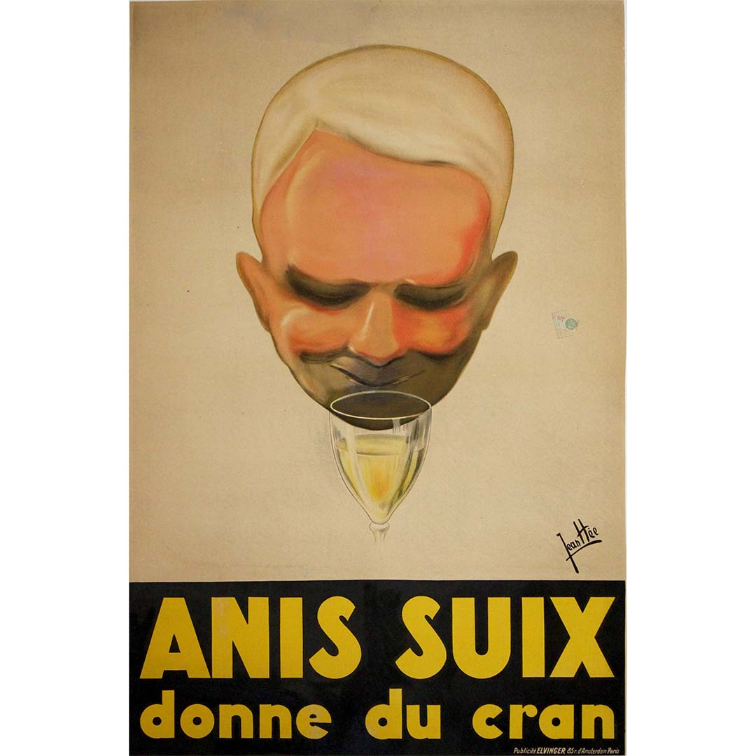 Cette affiche publicitaire originale de 1929 pour Anis Suix , illustrée par l'artiste français Jean Hée, est saisissante et incarne l'esprit audacieux et ludique de l'art publicitaire du début du XXe siècle. Le slogan « donne du cran » est associé à une caricature expressive d'un homme souriant et sûr de lui, contemplant un verre de liqueur anisée.