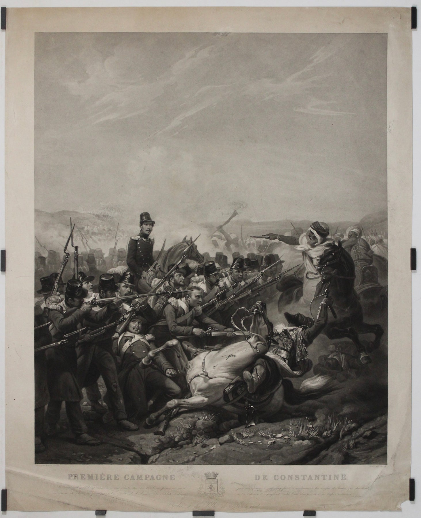 Cette puissante gravure du XIXe siècle, d'après Horace Vernet, représente un épisode dramatique de la Première Campagne de Constantin, l'une des principales expéditions militaires de la conquête de l'Algérie par la France. Réputé pour sa maîtrise des scènes de bataille, Vernet s'est spécialisé dans des œuvres alliant documentation historique et intensité théâtrale saisissante, et cette composition figure parmi les exemples les plus marquants de son imagerie martiale.