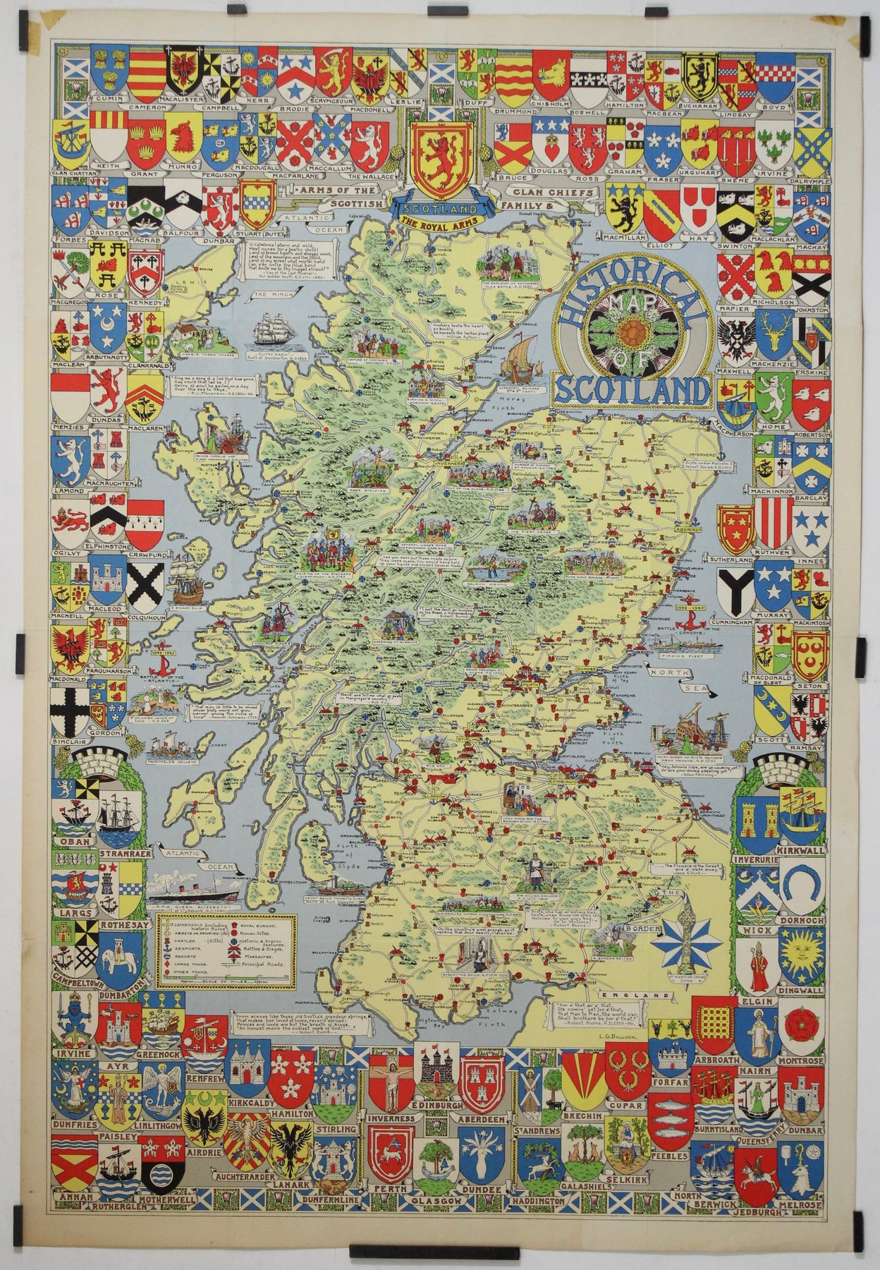 Cette carte historique de l'Écosse, richement détaillée et réalisée vers 1960 par Leslie George Bullock, est un exemple remarquable de la cartographie picturale du milieu du XXe siècle. Bullock était un illustrateur britannique, ancien fonctionnaire devenu cartographe, surtout connu pour ses cartes historiques décoratives et captivantes qui mêlaient informations géographiques et récits culturels.