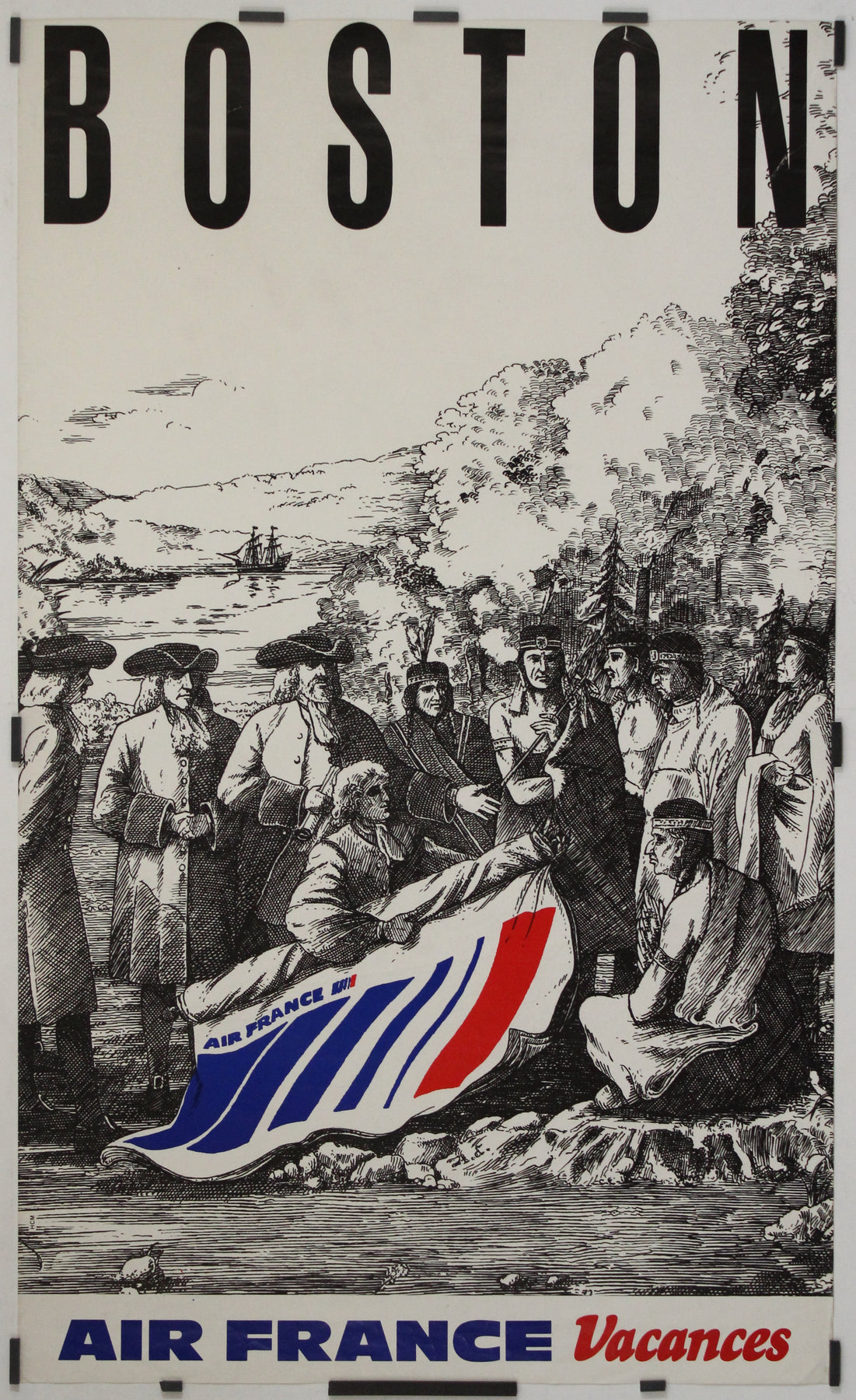 Spirituelle, inattendue et délicieusement anachronique, cette affiche de voyage originale d'Air France Vacances, datant des années 1970, mêle histoire coloniale et image de marque moderne dans une composition d'une originalité ludique. Conçue pour promouvoir Boston comme destination touristique, l'affiche juxtapose une scène classique de style gravure du XVIIe siècle — représentant vraisemblablement les premiers colons de Nouvelle-Angleterre et les Amérindiens — à une touche contemporaine audacieuse : le logo d'Air France drapé dans les couleurs tricolores emblématiques de la compagnie.