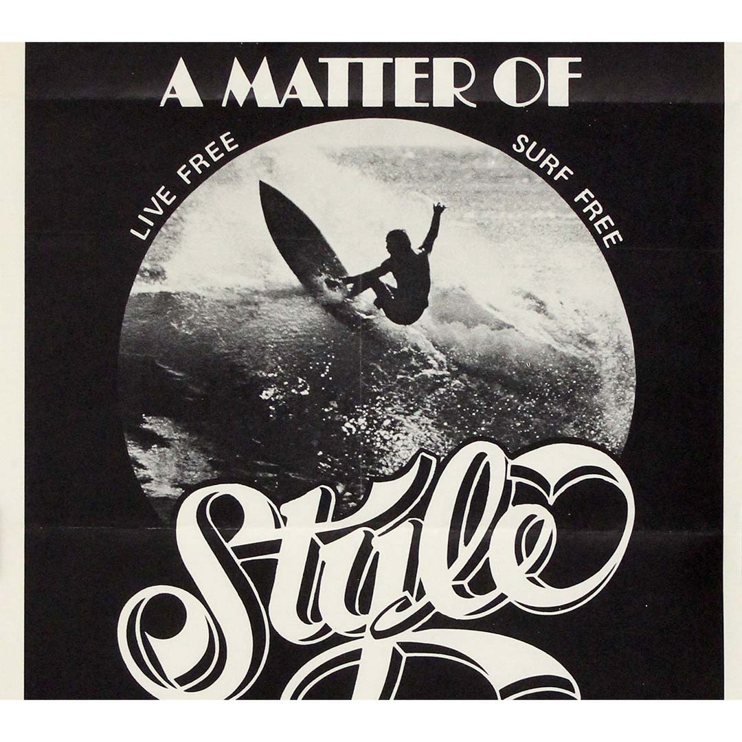 Cette affiche originale de 1976 pour le film « A Matter of Style » capture l'essence même de la culture surf des années 1970 : audacieuse, expressive et d'une liberté assumée. Distribué par Associated Screen Arts et produit par Golden Breed, le film est rapidement devenu culte dans le monde du surf, salué pour son approche unique qui met en valeur la fluidité, la forme et la finesse du surf.