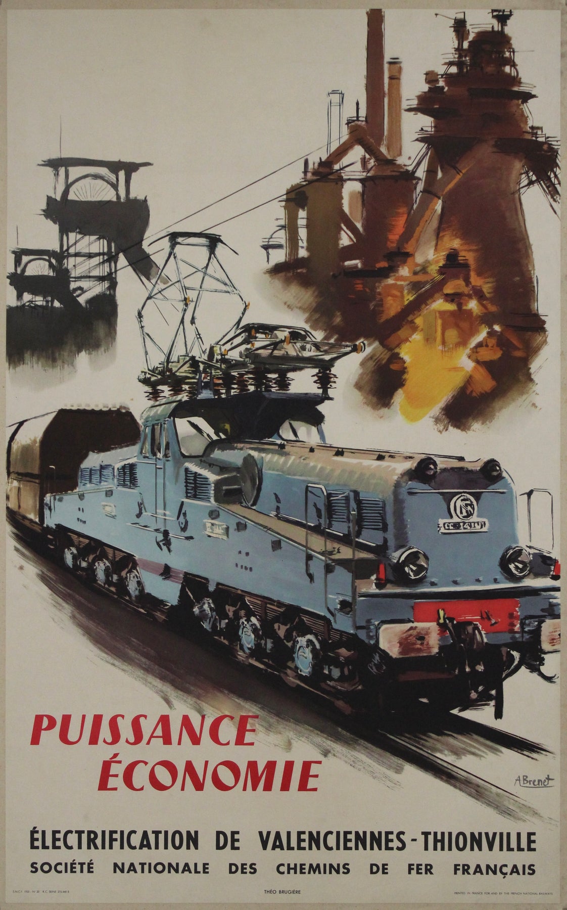 L'affiche originale de 1955, conçue par Albert Brenet pour la SNCF (Société Nationale des Chemins de fer Français), célèbre l'électrification de la ligne Valenciennes-Thionville, étape clé de la modernisation du réseau ferroviaire français. Cette affiche saisissante incarne l'optimisme de l'époque, le progrès technologique et la puissance industrielle, thèmes récurrents dans la publicité ferroviaire du milieu du XXe siècle.