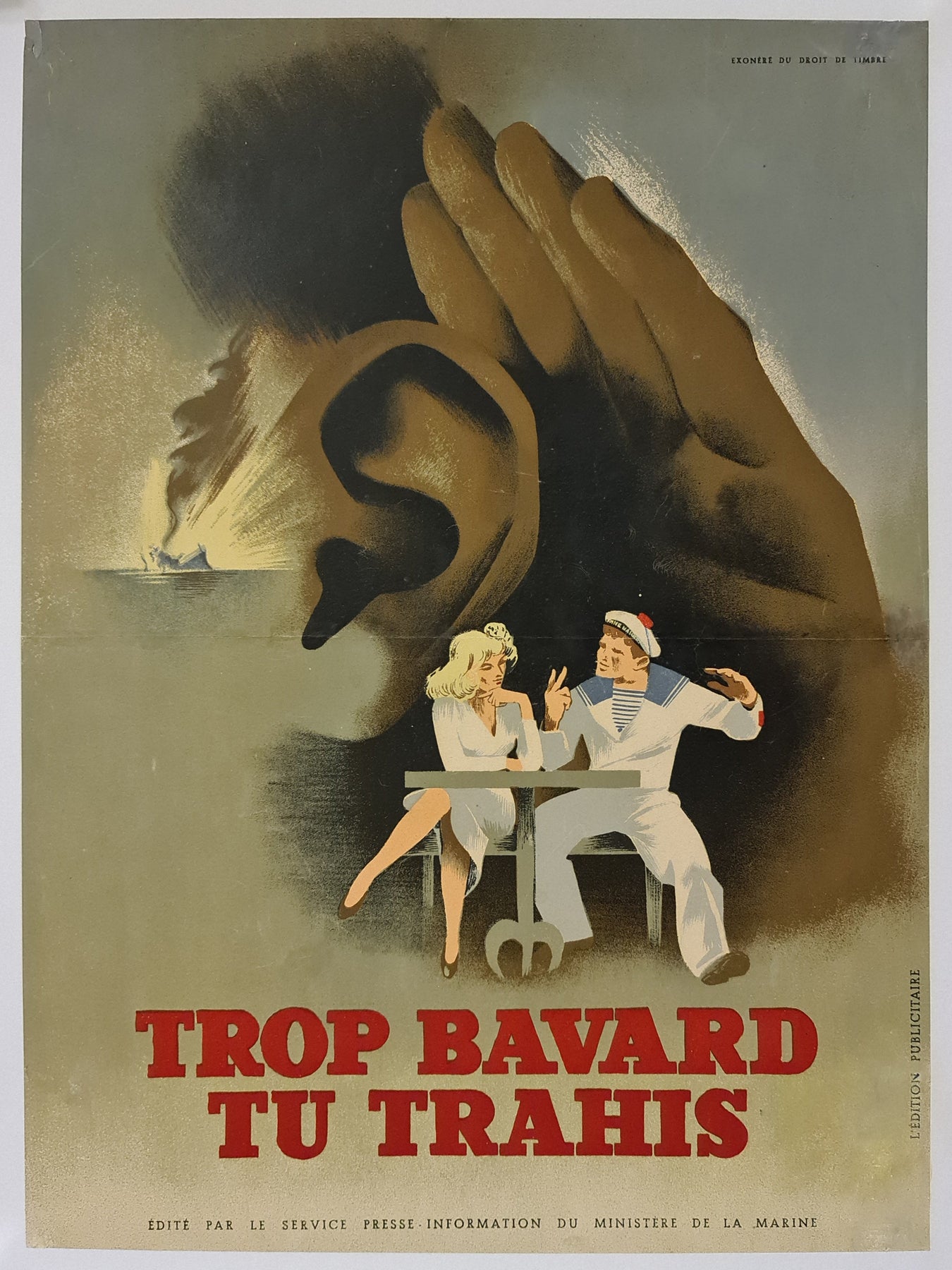 Affiche originale publiée par le service de presse et d'information du ministère de la Marine, qui avertit : trop bavard, vous trahissez.