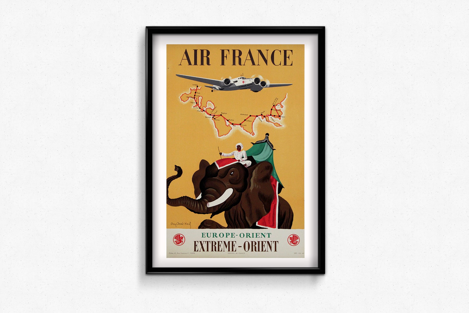 Cette affiche originale de 1938, créée par Ray Bret-Koch, avait pour but de promouvoir les liaisons long-courriers légendaires d'Air France, reliant l'Europe à l'Extrême-Orient. À une époque où le transport aérien international n'en était qu'à ses balbutiements, Air France a joué un rôle pionnier en reliant les continents et les cultures par les airs.